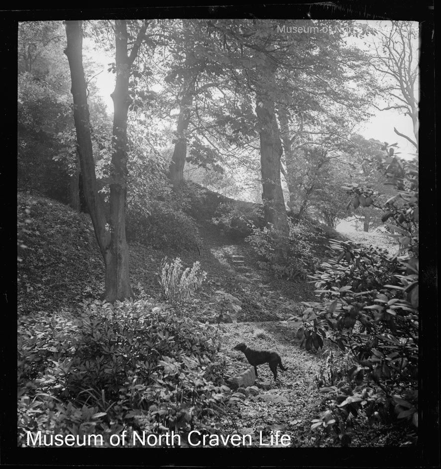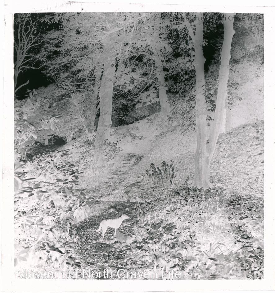A gelatin silver acetate film negative. A view of a wooded part of the grounds. A stepped path leading uphill appears in the background. A dog stands in the mid-groundCollection