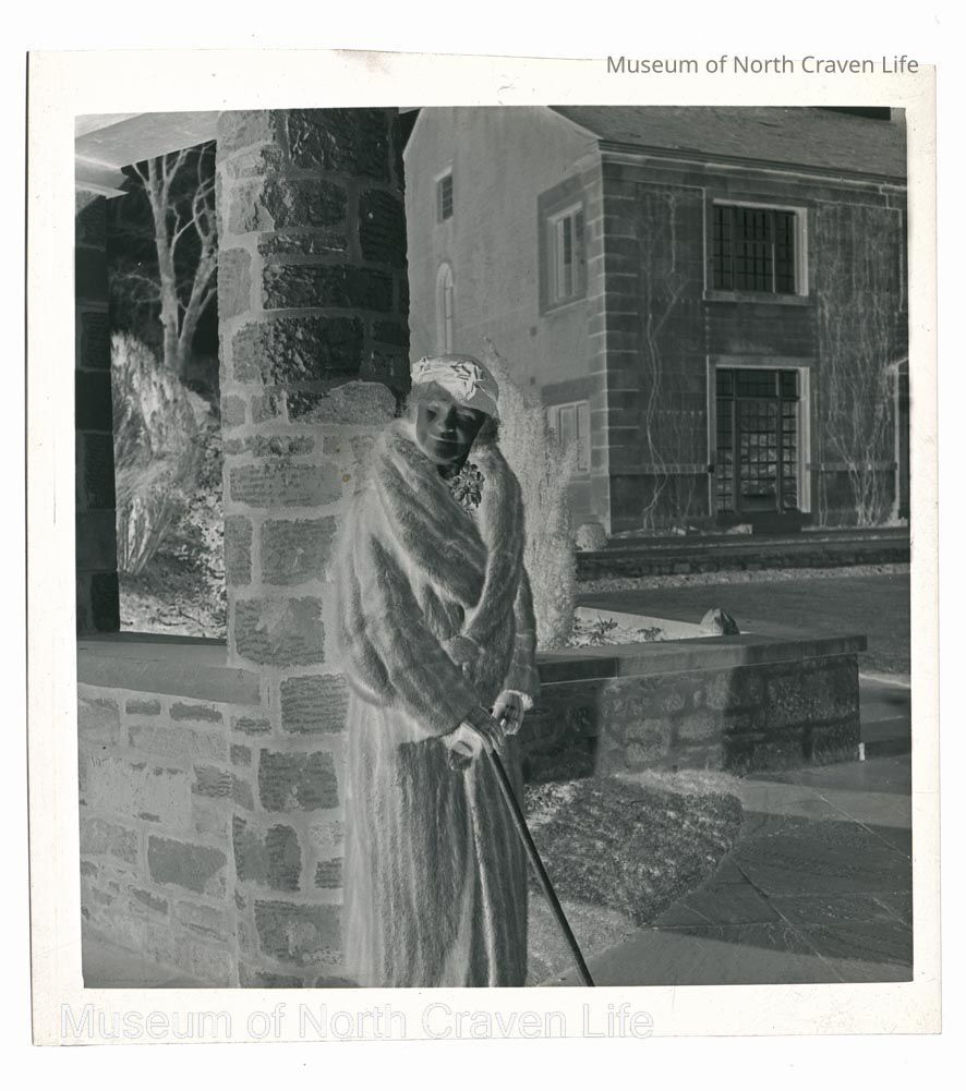 A gelatin silver acetate film negative. A portrait of a woman standing in the entrance of the summerhouse. She is dressed in a fur coat and holds a stickCollection