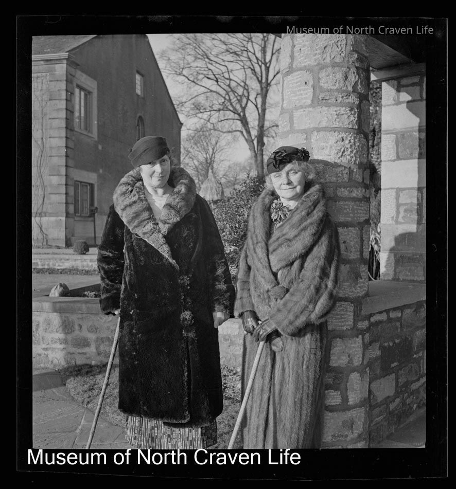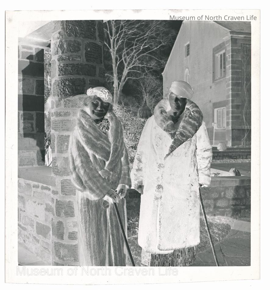 A gelatin silver acetate film negative. A portrait of two women standing in the entrance of the summerhouse. They are dressed in fur coats and each holds a stickCollection