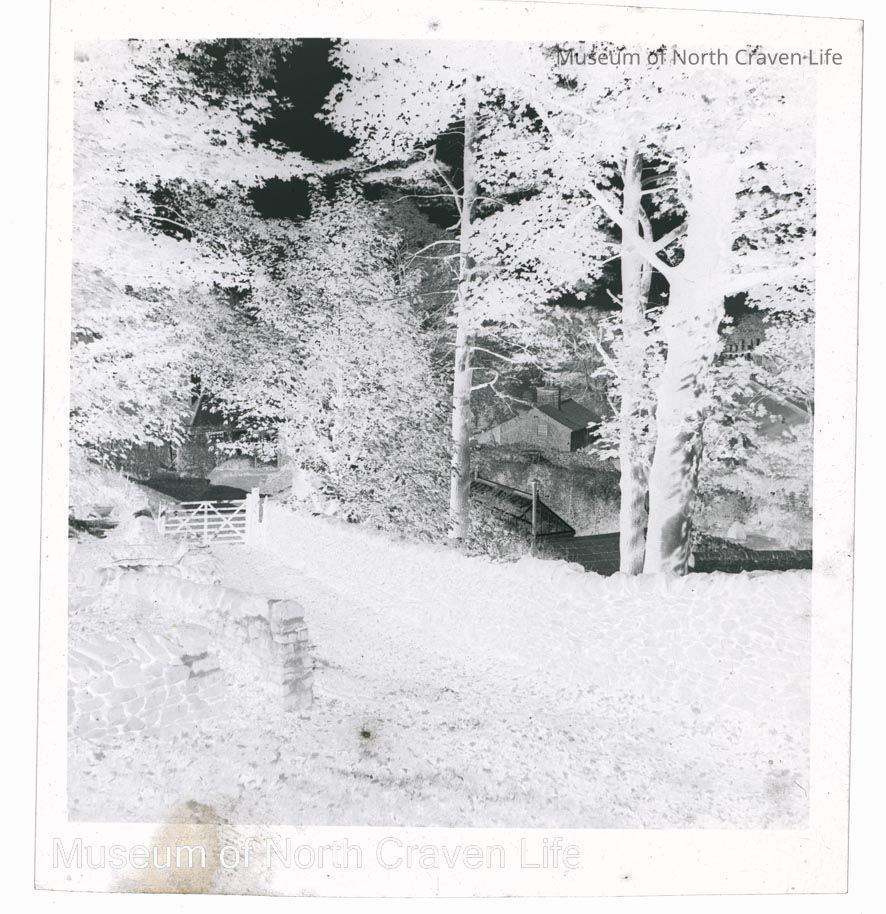 A gelatin silver acetate film negative. A view of the greenhouse and the main house from under the treesCollection