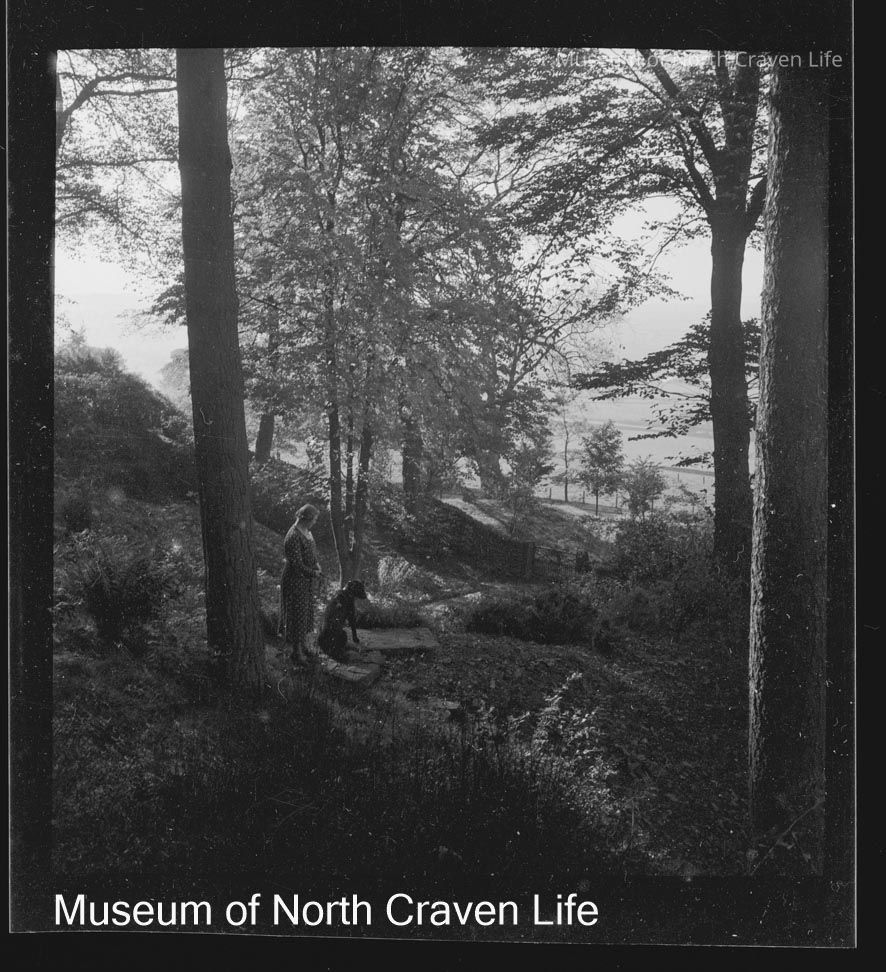 A gelatin silver acetate film negative. A view of the stepped path under the trees in the grounds looking down. A woman and a dog appear at the top of the stepsCollection