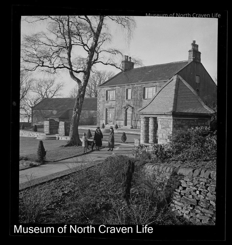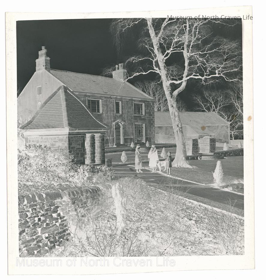 A gelatin silver acetate film negative. A view of the house seen from behind the summerhouse across the lawns. Two women, a girl and a dog stand in the mid-groundCollection