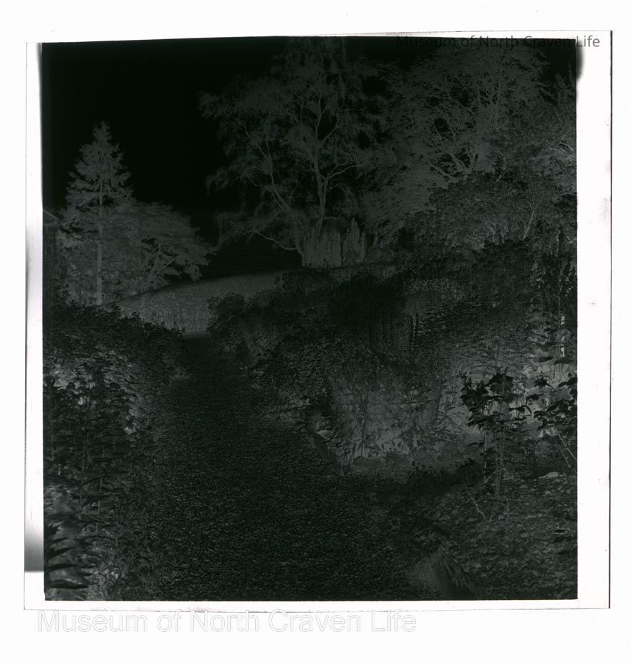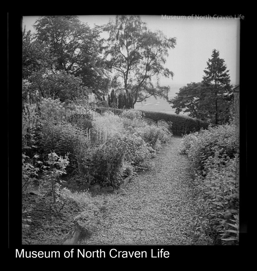 A gelatin silver film negative. A view of the grounds. A path leads through flower beds towards a hedgeCollection