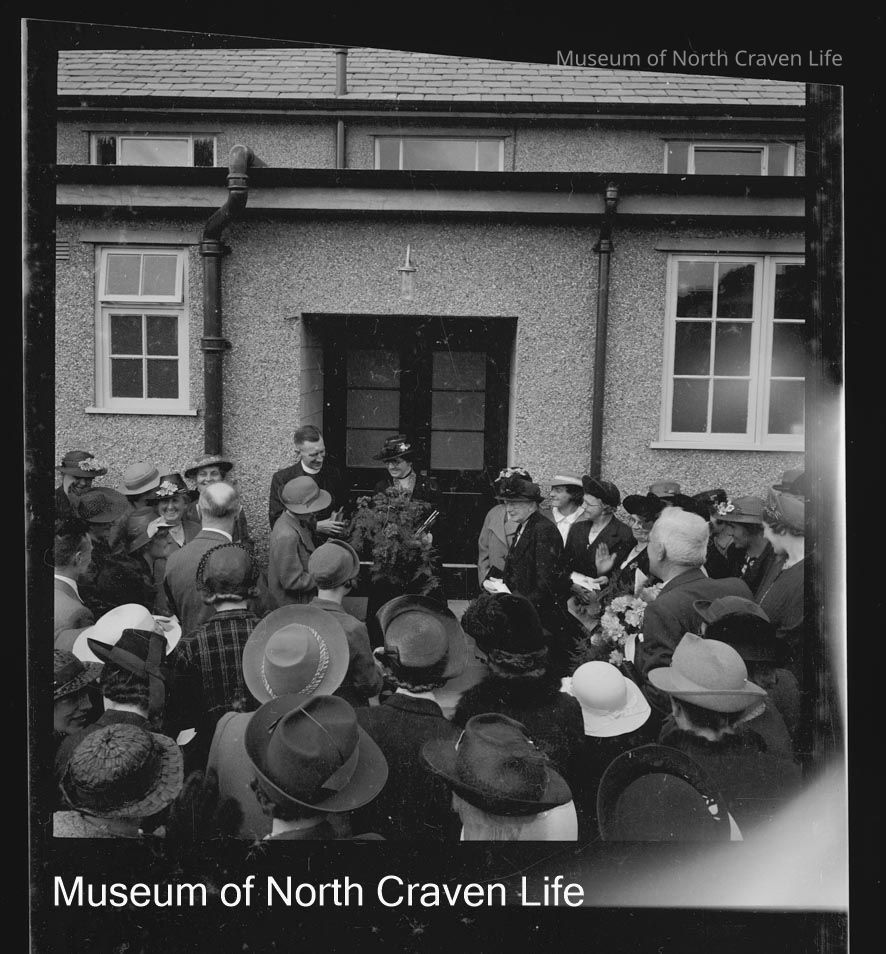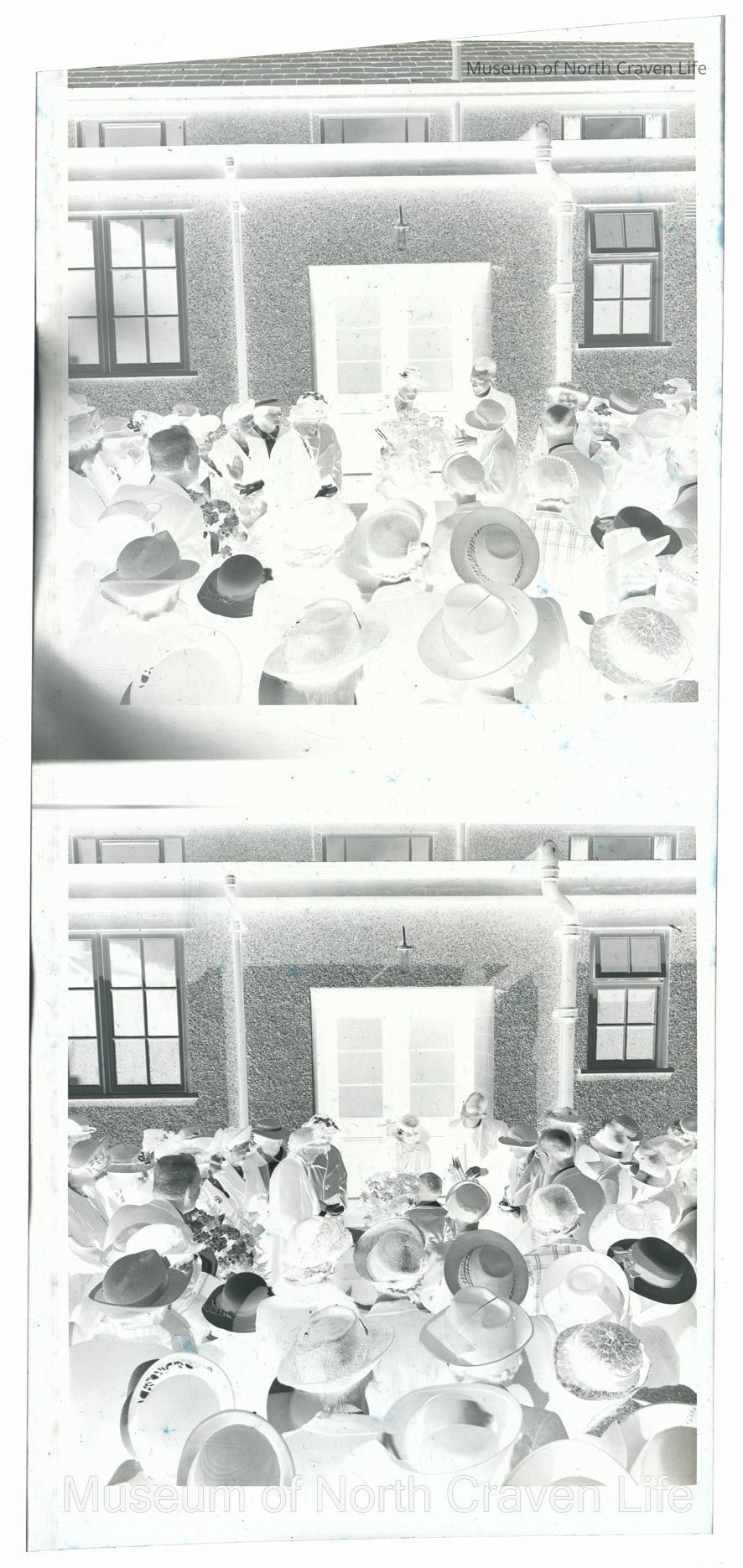 A gelatin silver film negative. Methodist Sunday School. A minister and a woman holding a floral display stand before a crowd of people in front of the entrance to a buildingCollection