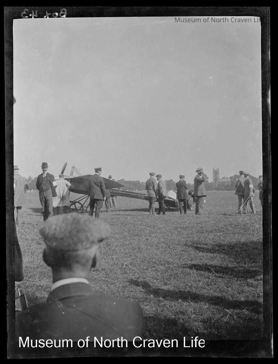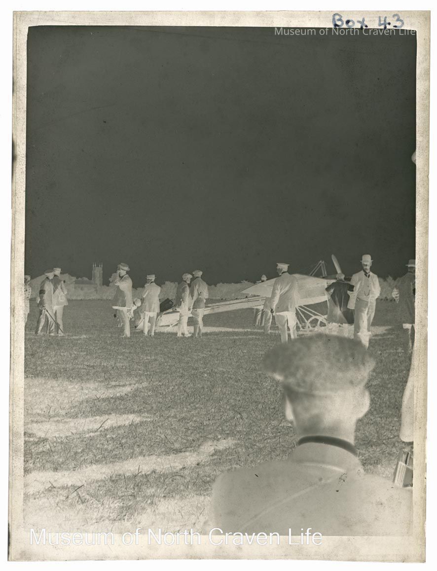 A half-plate gelatin silver film negative. Early single-winged aircraft with numerous people attendingCollection