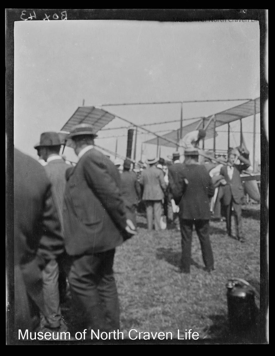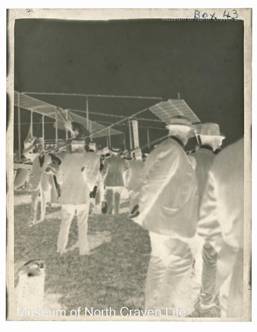 A half-plate gelatin silver film negative. Early bi-plane aircraft with numerous people attendingCollection