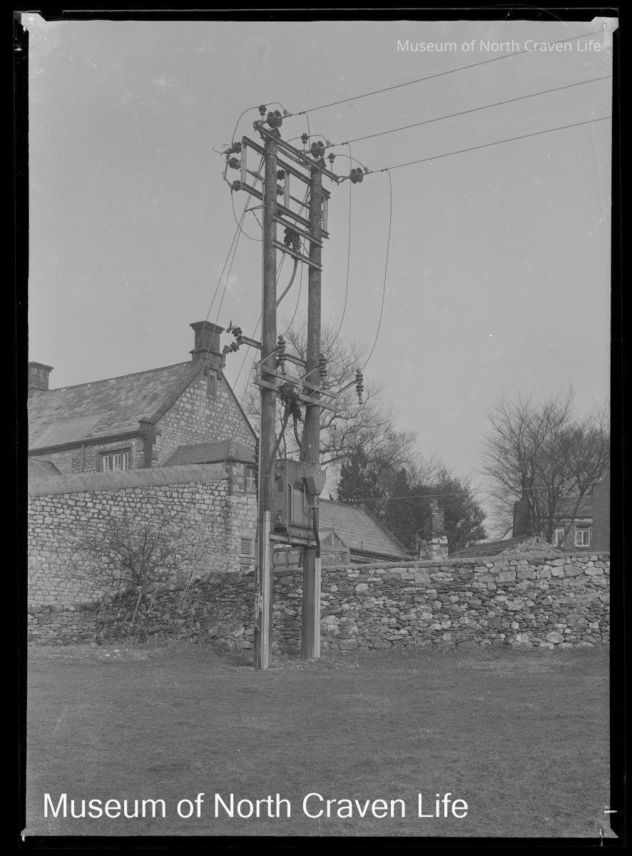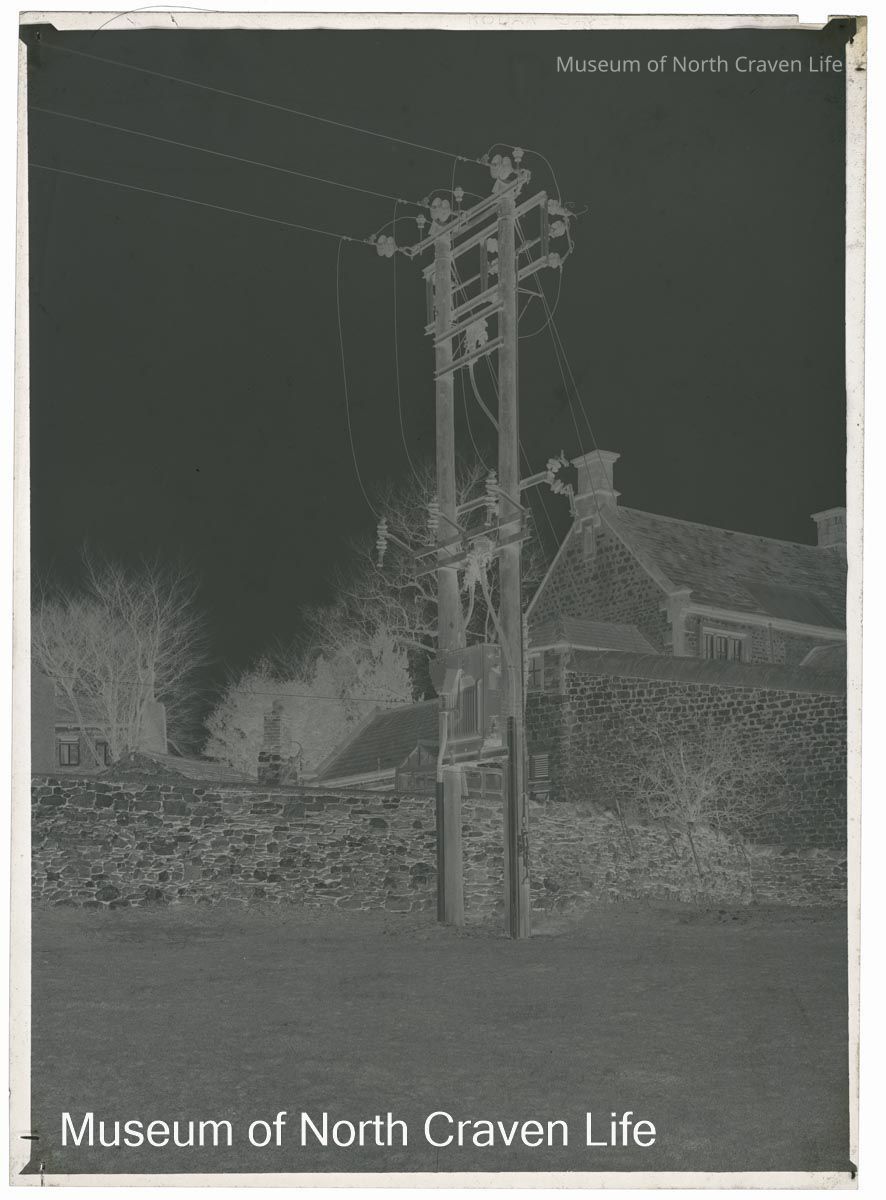 A half-plate gelatin silver film negative. A view of an electricity pole of the N.W. Electricity Board (Austwick Ingleton Line). The pole stands in front of a stone wall adjacent to a houseCollection