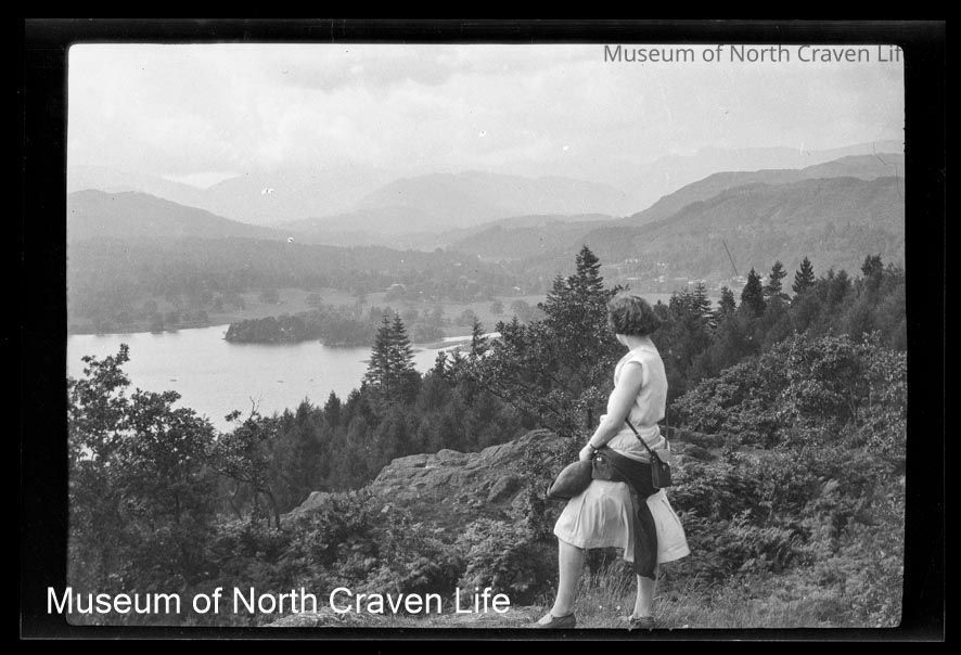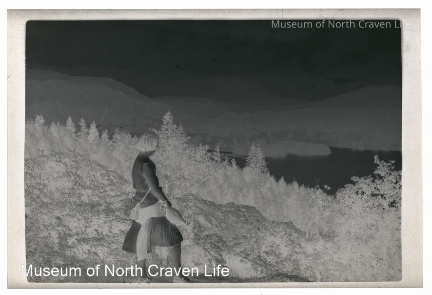 A half-plate gelatin silver acetate film negative. A view of a woman standing on a hillside looking across to a lake and some distant peaks, possibly the Lake DistrictCollection