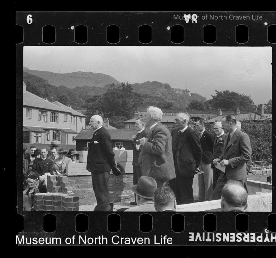 A gelatin silver film negative. A group consisting of a minister and other individuals addressing an assembled crowd of men and women assembled at the opening of the original St John's Methodist Hall on Mains ViewCollection