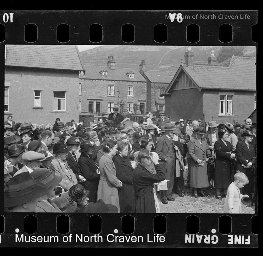 A gelatin silver film negative. A group of men and women assembled at the opening of the original St John's Methodist Hall on Mains ViewCollection
