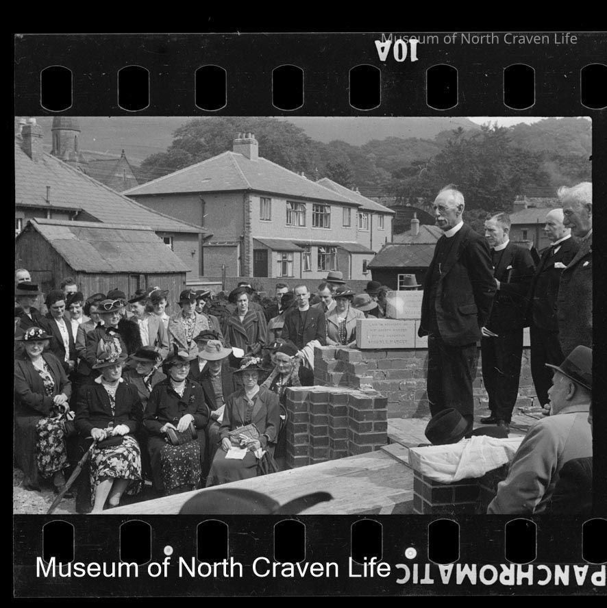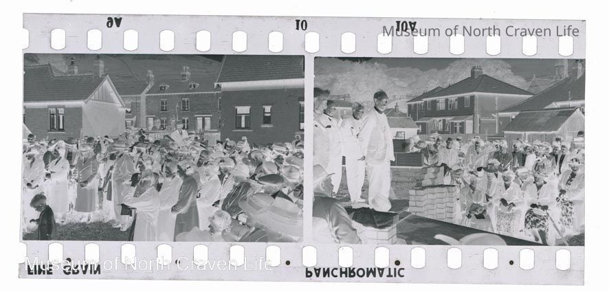 A gelatin silver film negative. A group of clergymen address an assembled crowd at the opening of the original St John's Methodist Hall on Mains ViewCollection