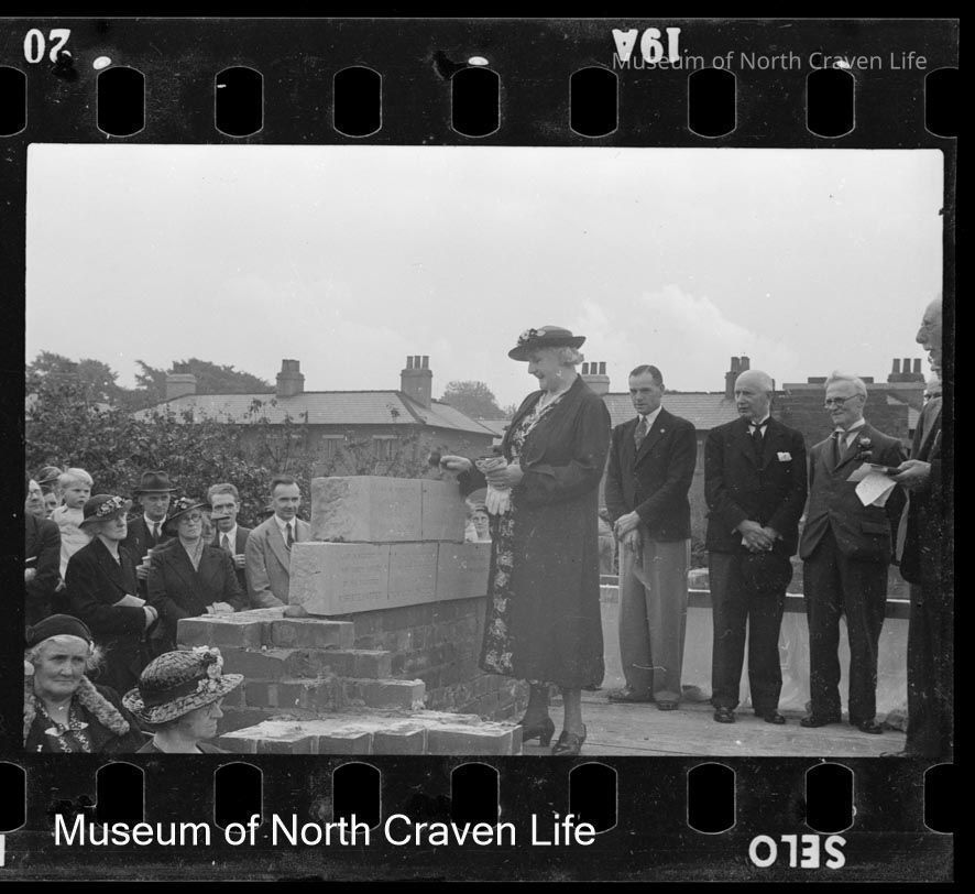 A gelatin silver film negative. A group of a woman laying a foundation stone with other individuals before an assembled crowd at the opening of the original St John's Methodist Hall on Mains ViewCollection