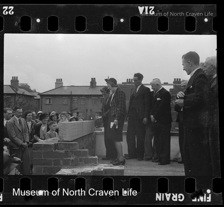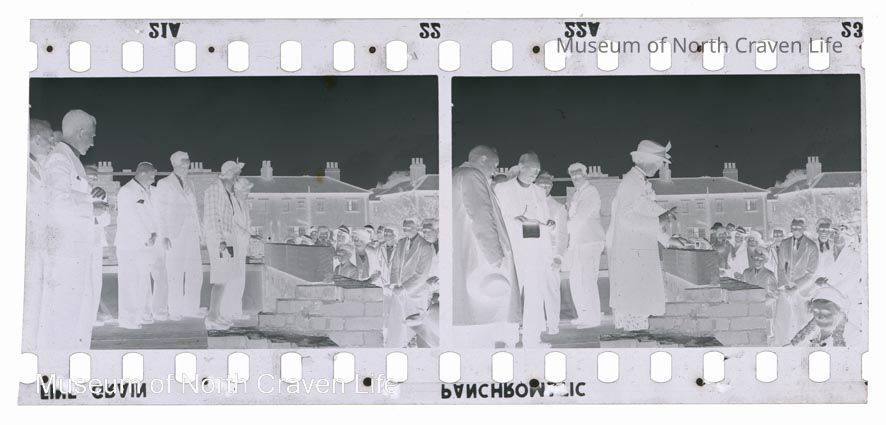 A gelatin silver film negative. A group of a woman laying a foundation stone with other individuals and clergymen before an assembled crowd at the opening of the original St John's Methodist Hall on Mains ViewCollection
