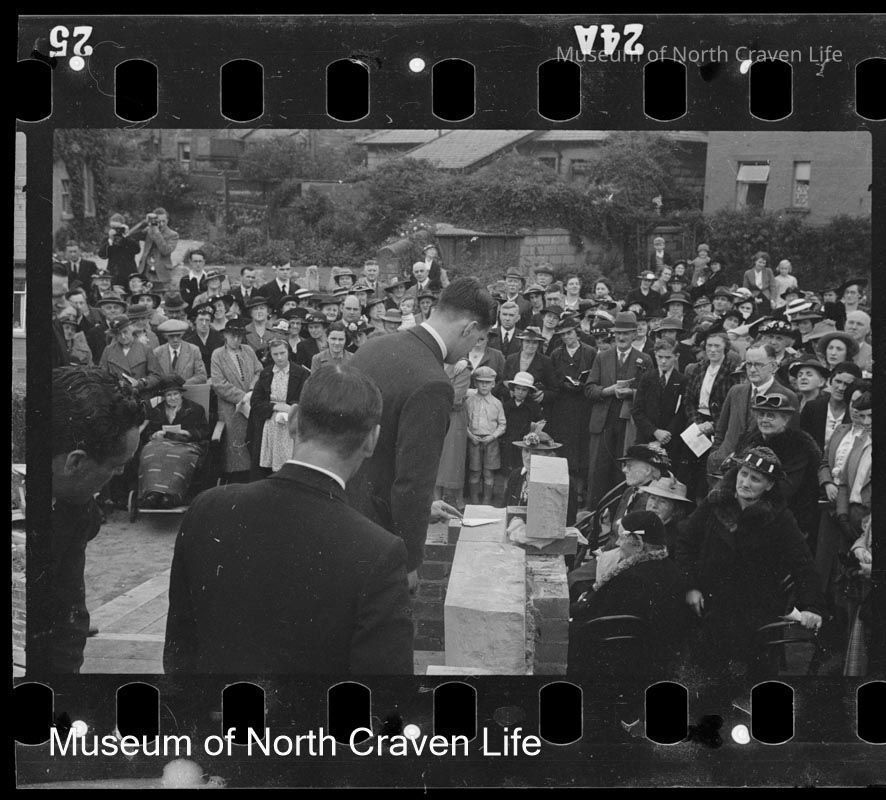 A gelatin silver film negative. A group of a man laying a foundation stone with other individuals before an assembled crowd at the opening of the original St John's Methodist Hall on Mains ViewCollection