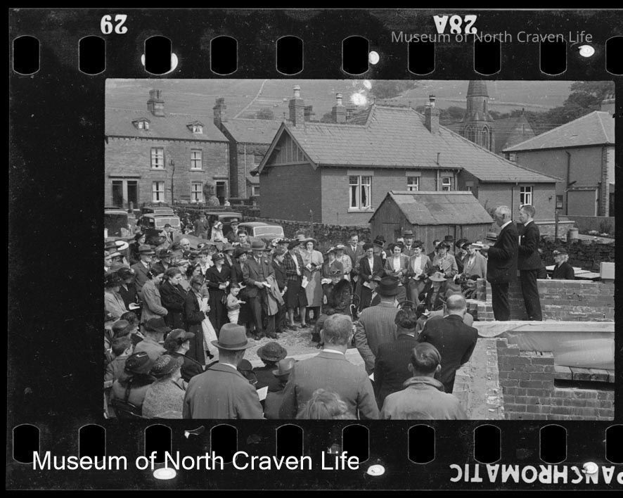 A gelatin silver film negative. Two clergymen addressing an assembled crowd at the opening of the original St John's Methodist Hall on Mains ViewCollection
