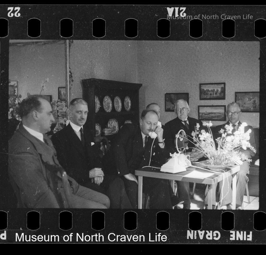 A gelatin silver film negative. A group of six men are seated around a telephone on a table, one of whom holds the receiverCollection