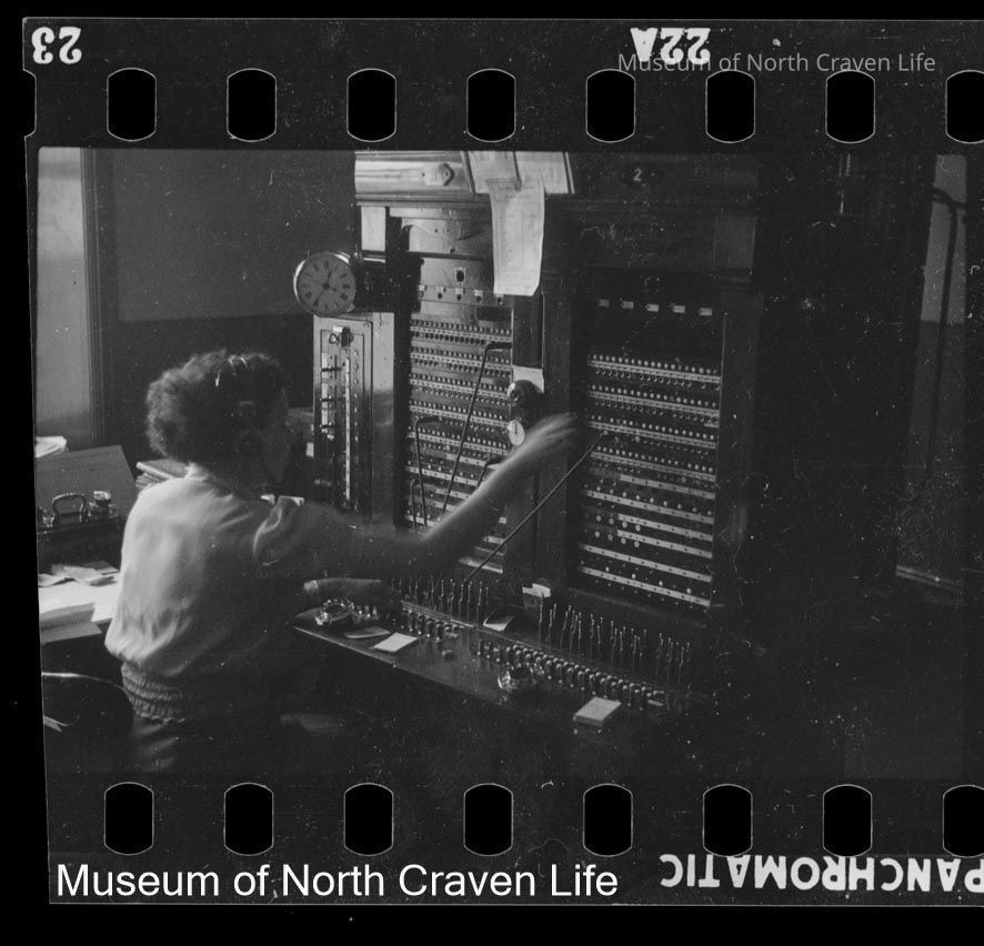 A gelatin silver film negative. A female operator is seated in front of a Telephone Exchange, making telephone connections (1 of 4)Collection