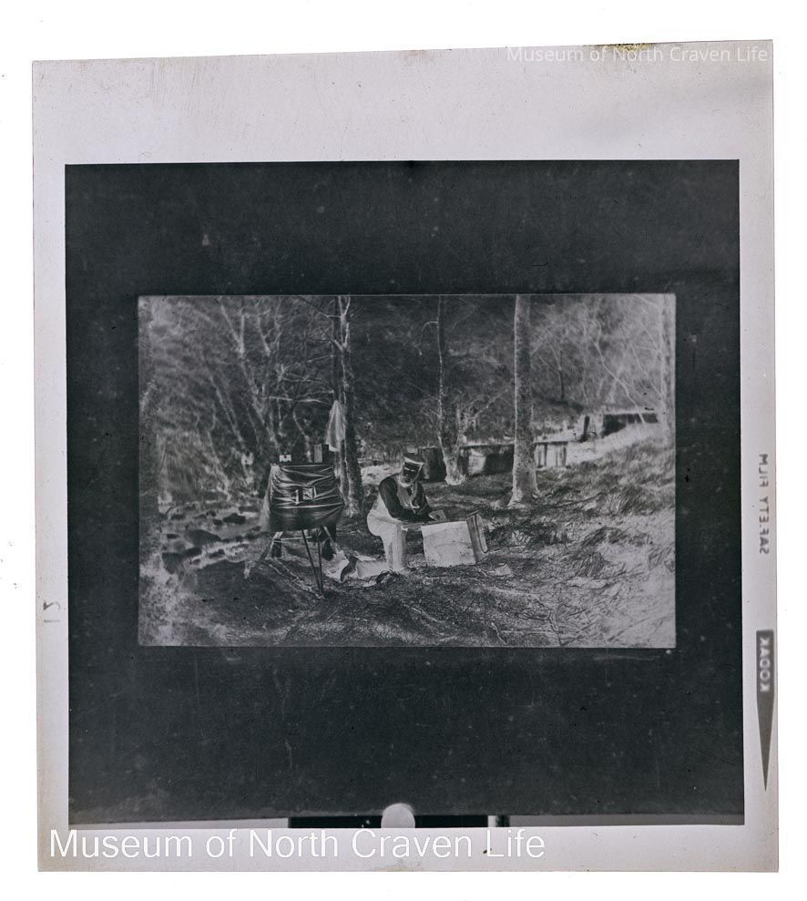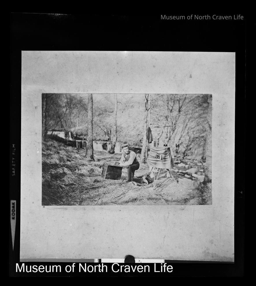 A gelatin silver film negative 21/4". Portrait of photographer Michael Horner at work, c. 1867. Depicted next to a collodion dark tent, at Scaleber Force, North Yorkshire. Subject is on one knee, loading or unloading a stereographic lens board from a leather carrying case. Copy negative from print.Collection