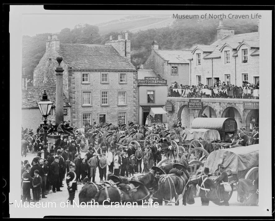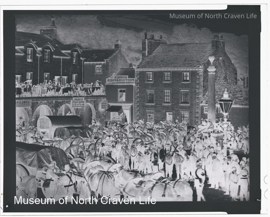 An acetate film negative. A view of troops assembled in Settle Market Square. A crowd of onlookers stand around. Horner's photography business appears in the background (HORNER PHOTOGRAPHER)Collection