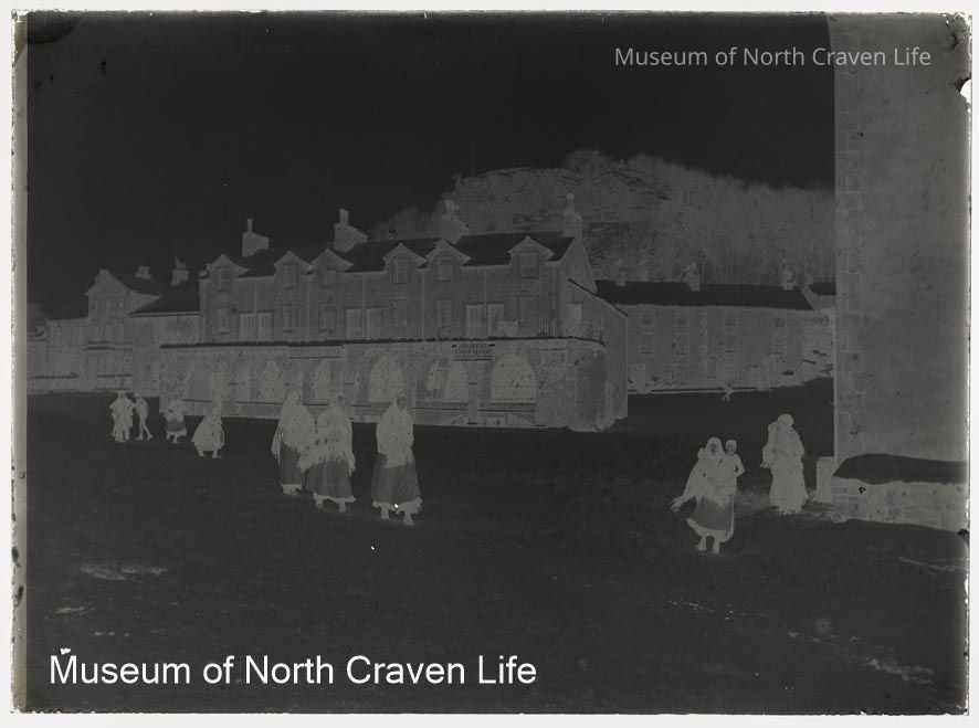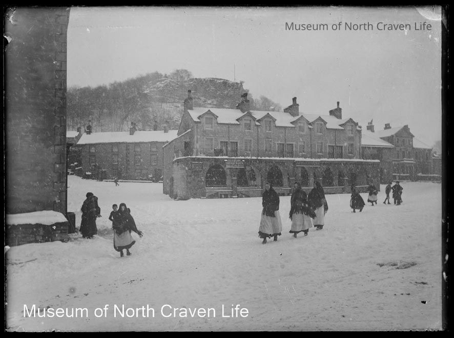 A half-plate gelatin silver glass negative. A view of Settle Market Square in the snow. A group of mill workers in shawls cross the squareCollection
