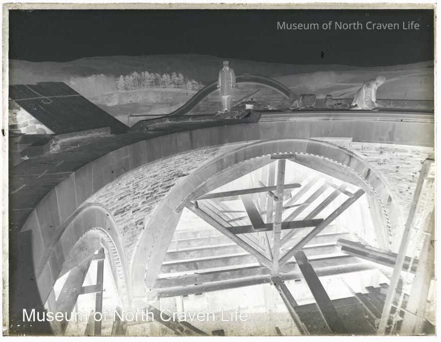 A full-plate gelatin silver glass negative. A view of the dome of Giggleswick School Chapel during construction (Victoria's Diamond Jubilee), 1897. Two men appear on the rim of the dome which is supported by wooden scaffoldingCollection