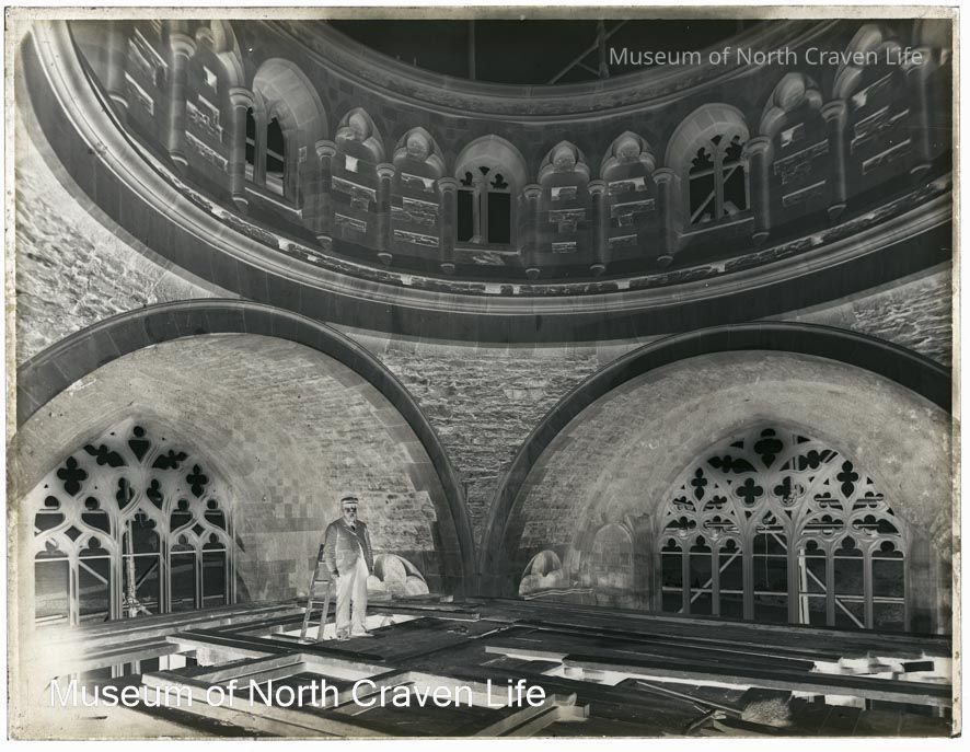 A full-plate gelatin silver glass negative. A view of the interior of the dome of Giggleswick School Chapel during construction (Victoria's Diamond Jubilee), 1897. The roof of the dome is still open to the elements; a man stands in the centre of the dome on a wooden platformCollection