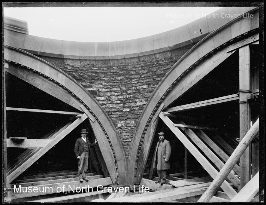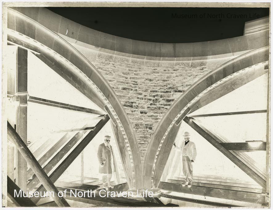 A full-plate gelatin silver glass negative. A view of the interior of the dome of Giggleswick School Chapel during construction (Victoria's Diamond Jubilee), 1897. The roof of the dome is still open to the elements; two men stand on wooden scaffolding supporting the arches of the dome wallCollection