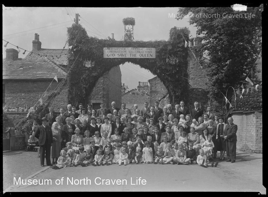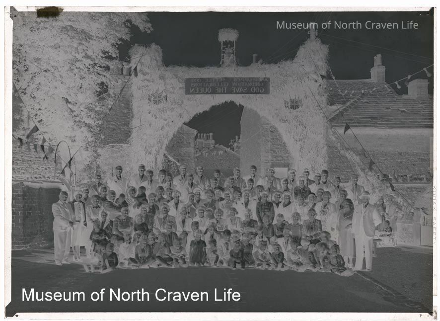 A gelatin silver acetate film negative. A view of Settle Coronation Groups with decorative arch. Men, women and children are ranged in front of the commemorative archCollection