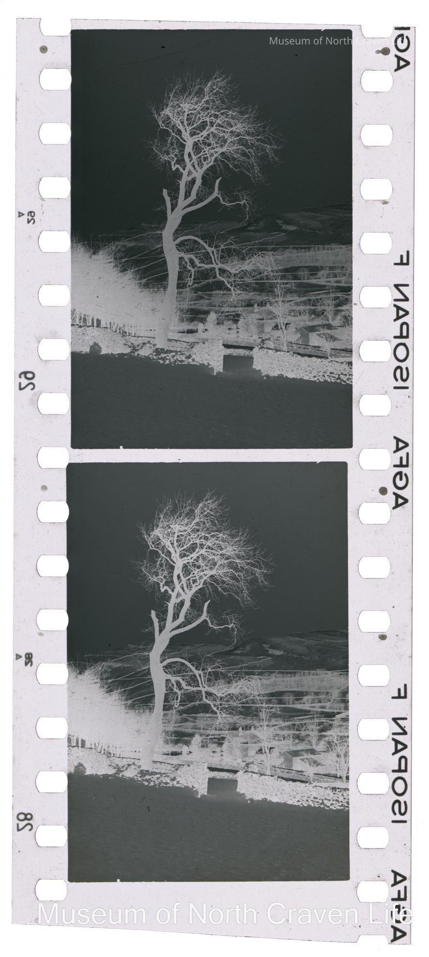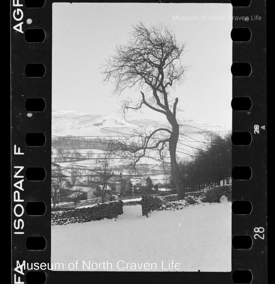 A 35mm b/w film negative. A view of a snow-covered landscape across the valley towards Pen-y-Ghent ; a stone wall crosses a field in the foreground with a house below in the mid-groundCollection