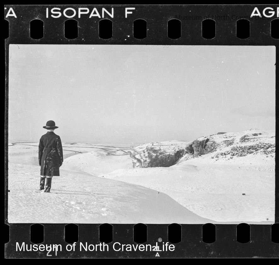A 35mm b/w film negative. A view of a snow-covered landscape across the valley towards Pen-y-Ghent ; a boy stands in the foreground looking towards the mountainCollection