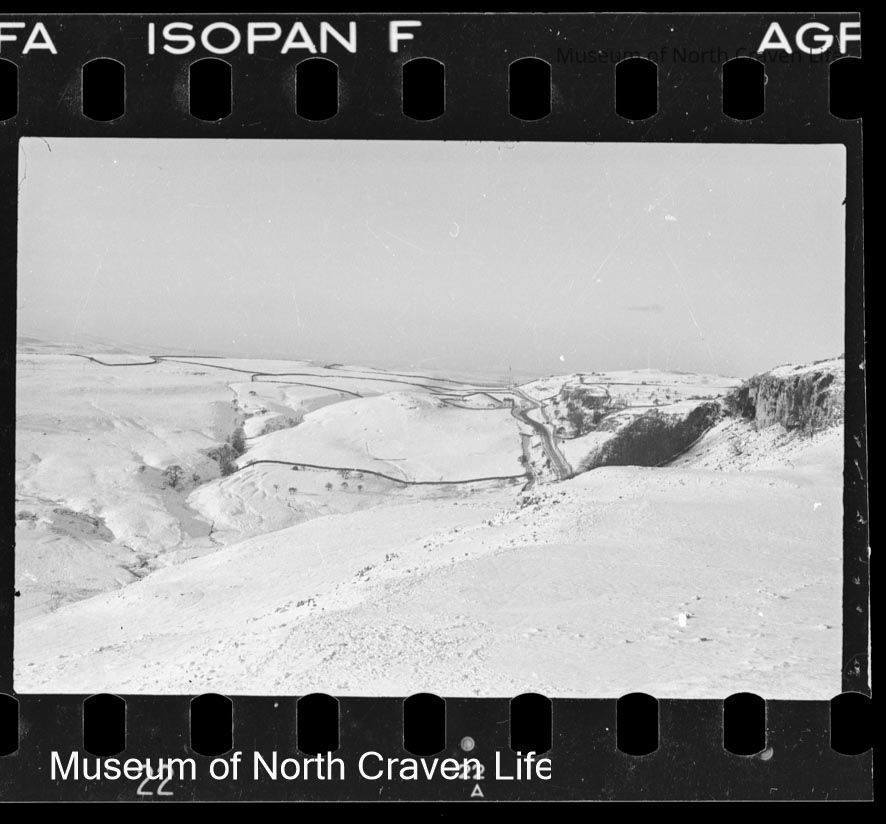 A 35mm b/w film negative. A view of a snow-covered landscape across the valley towards Pen-y-GhentCollection