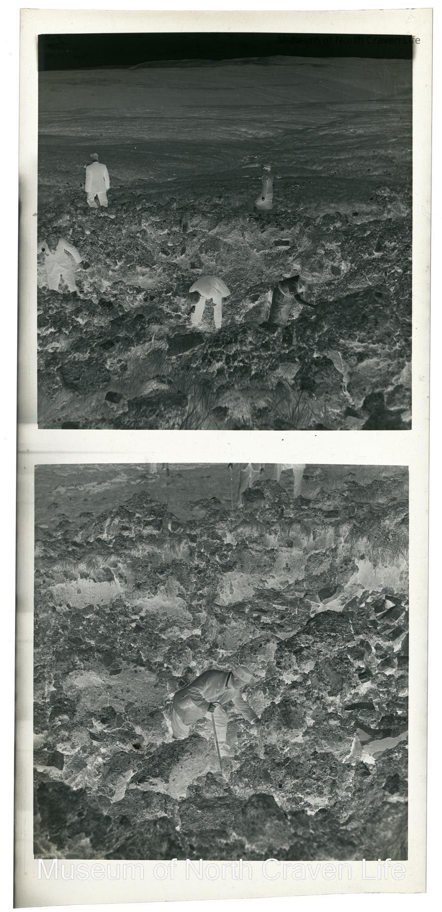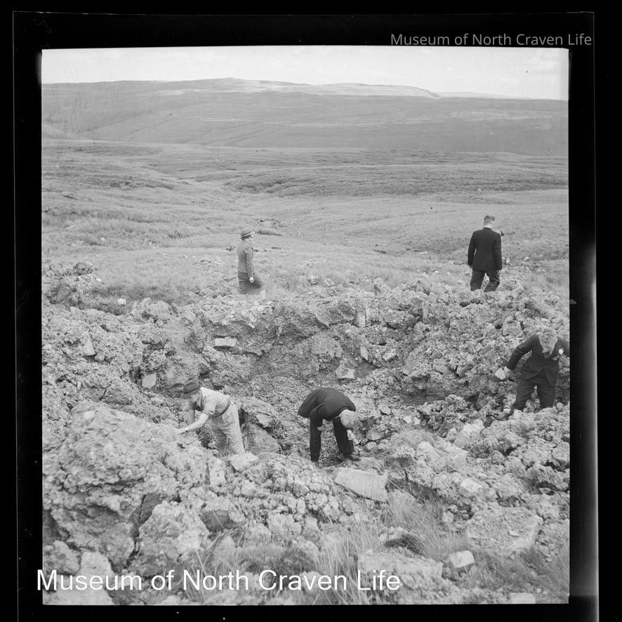 A 2 ¼" b/w acetate film negative. A view of Bomb Holes on Darnbrook Moor. Four men and a woman are inspecting the groundCollection