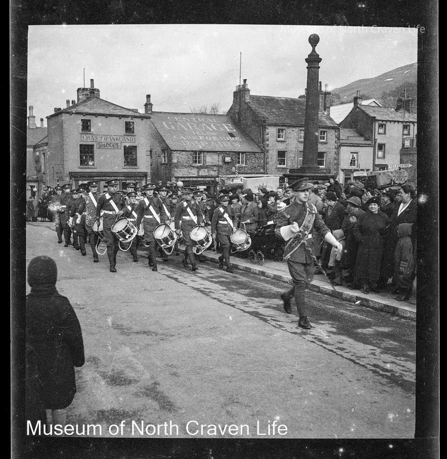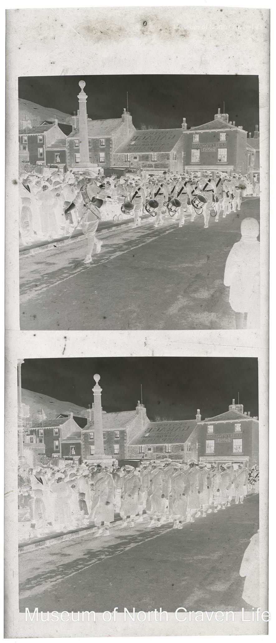 A 2 ¼" b/w acetate film negative. Group portrait of a military band marching in Settle Market Square : War Parade, 1945Collection