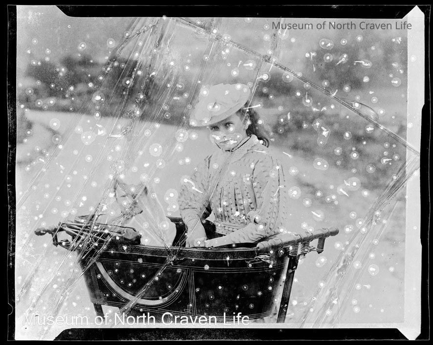 An 120 x 100 mm b/w film negative. A portrait of a child in a very old pram with a young woman standing behind the pramCollection