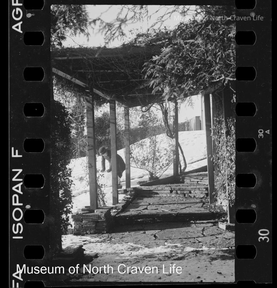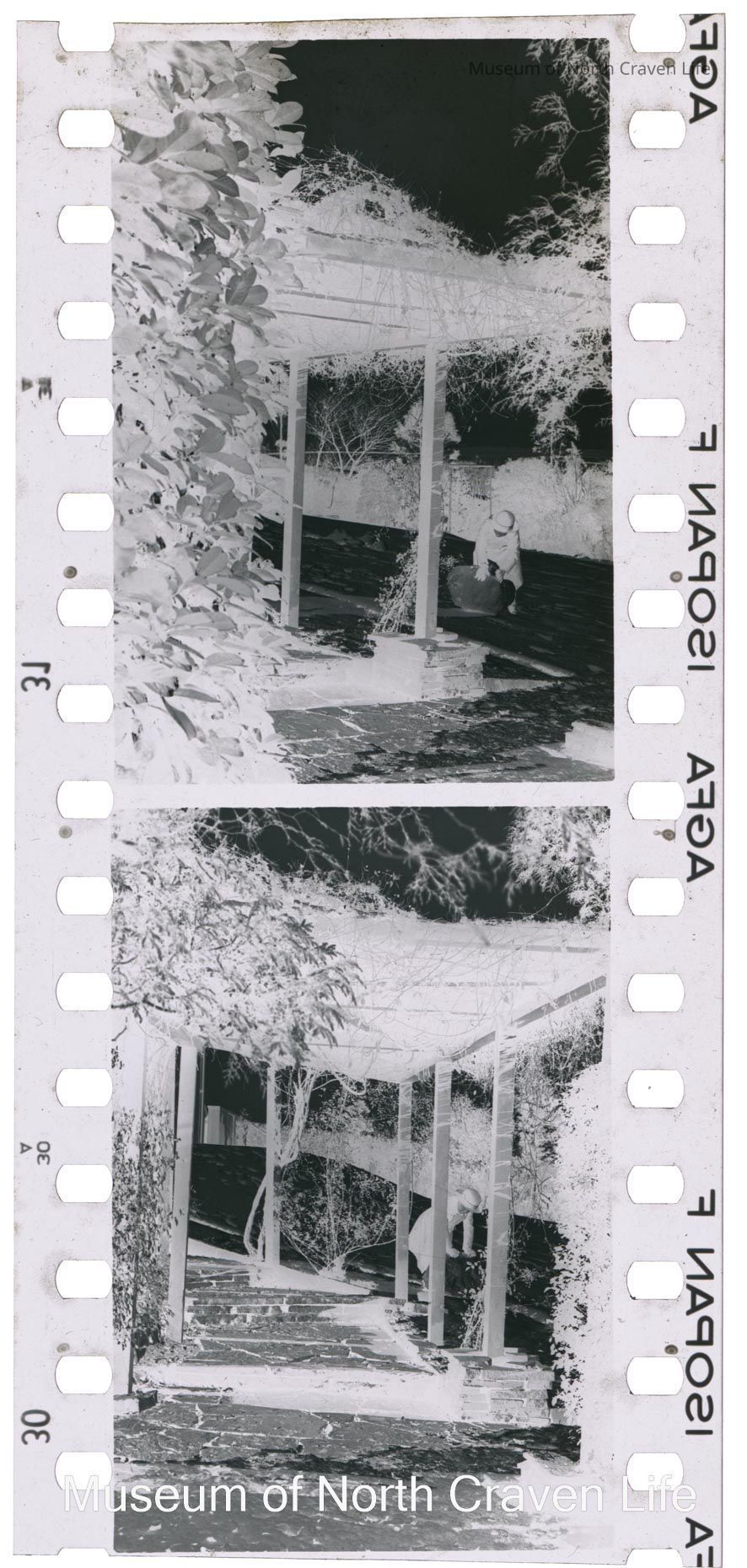 A 35mm b/w film negative. A view of a child making a snowman in the open beside a covered walkCollection