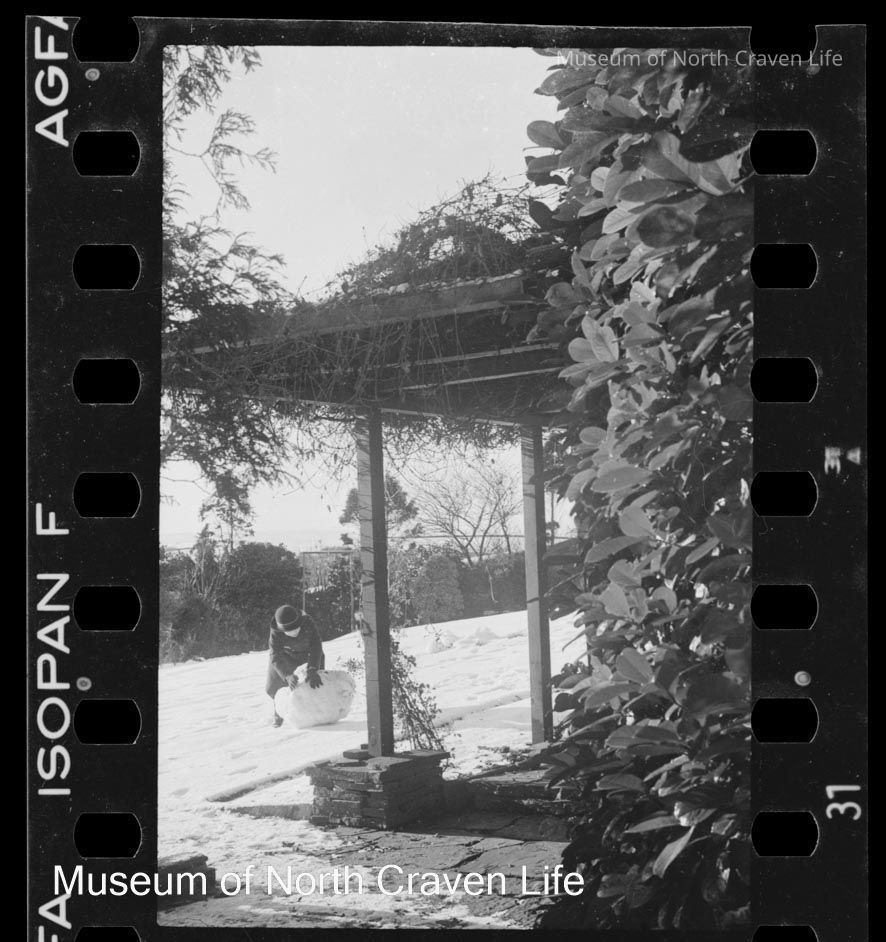 A 35mm b/w film negative. A view of a child making a snowman in the open beside a covered walkCollection