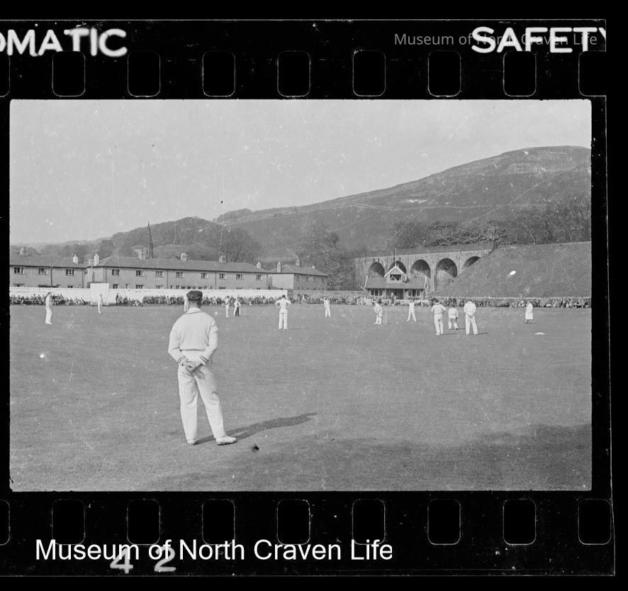 A 35mm b/w film negative. A view of cricketers in whites on the field (Settle Cricket Club). A viaduct appears in the background.Collection
