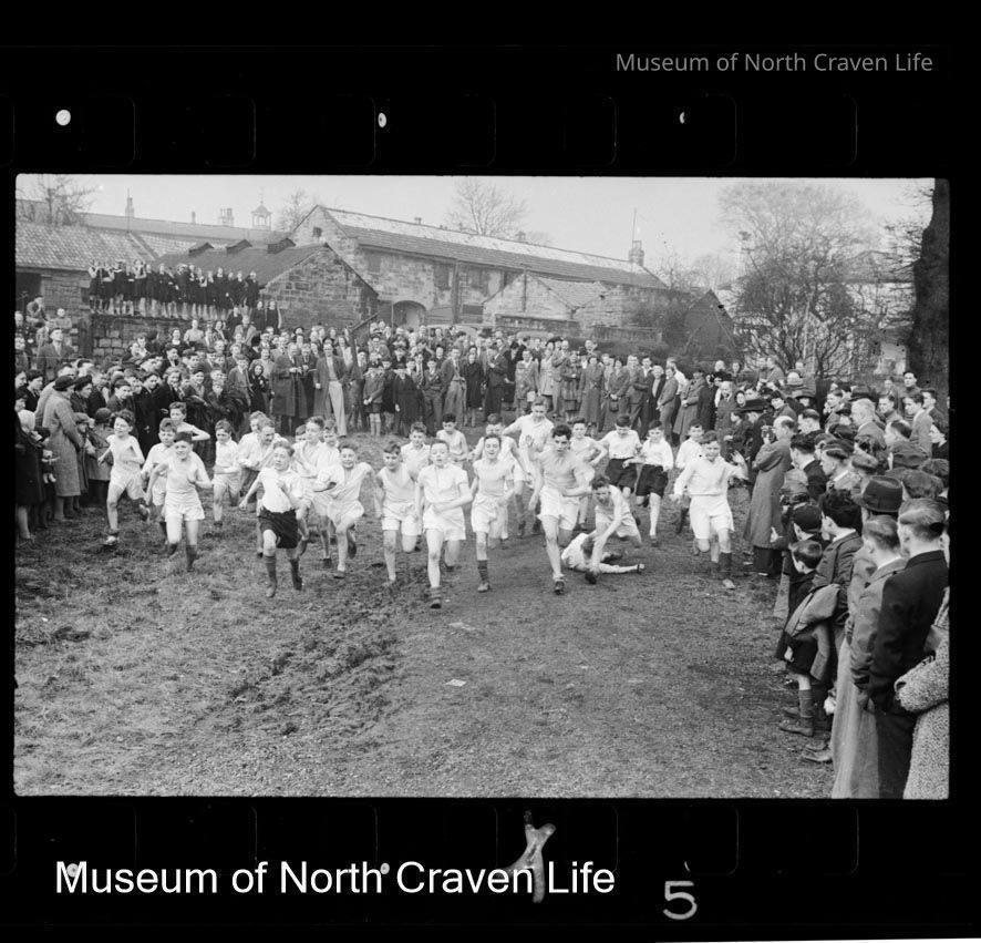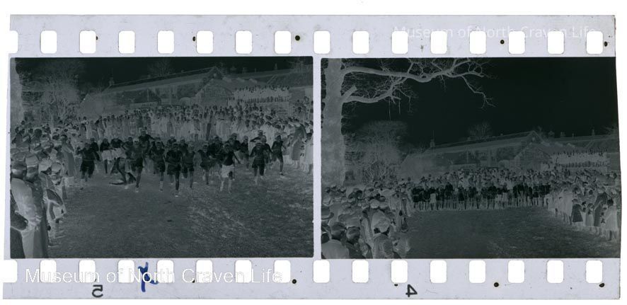 A 35mm b/w film negative. A view of a sporting event that takes place in a field. The race has started! The boys run, watched by a large crowd of onlookersCollection
