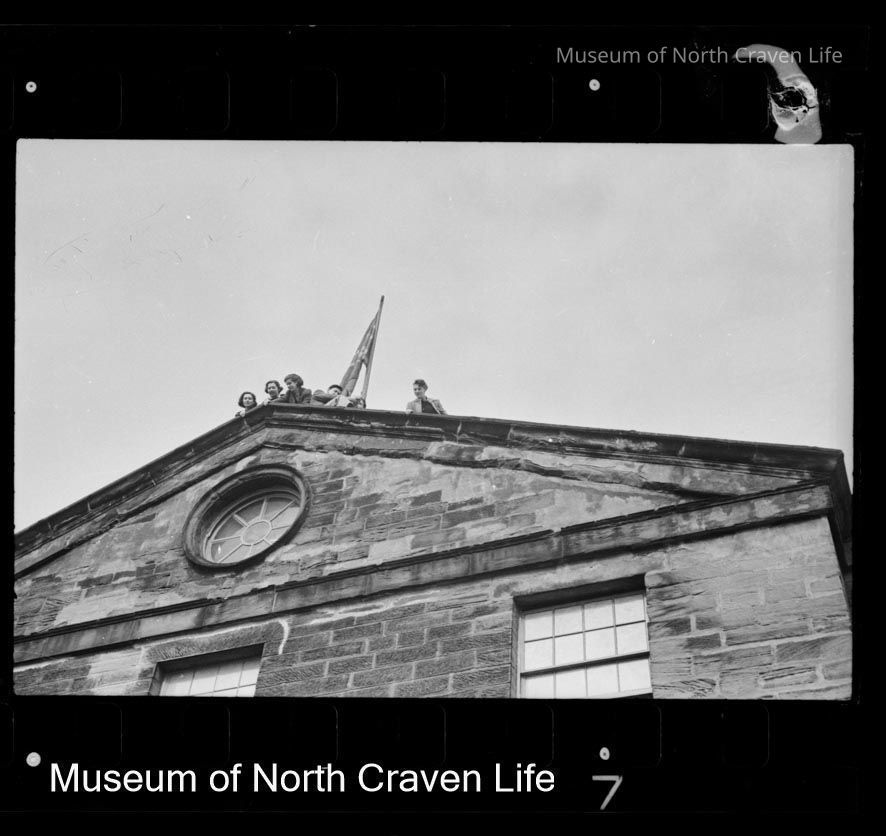 A 35mm b/w film negative. A group portrait of unidentified people on a roof; a flag flies from a flagpole behind themCollection