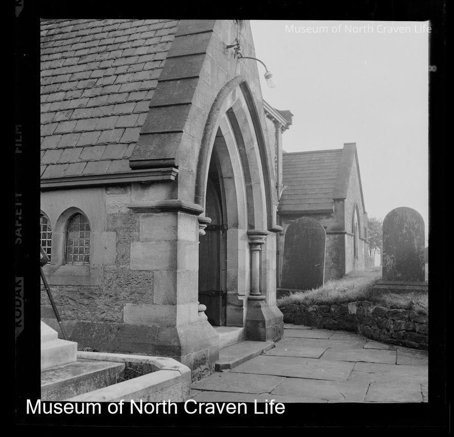 A 2 ¼" b/w acetate film negative. A view of an unidentified church porch. Gravestones appear to the rightCollection