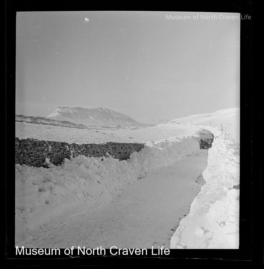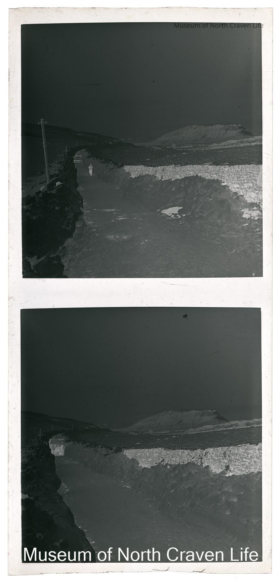 A 2 ¼" b/w acetate film negative. A view of a snow-covered landscape ; a man stands in a road that has been cleared of snow with Pen-y-Ghent in the backgroundCollection
