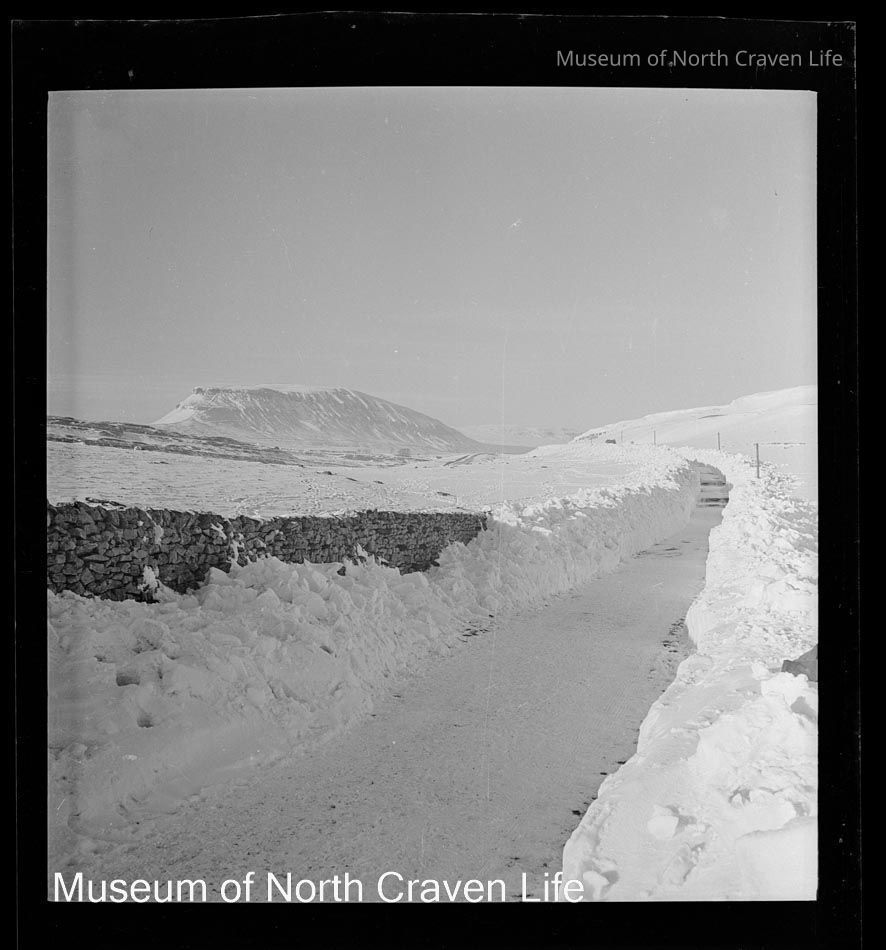 A 2 ¼" b/w acetate film negative. A view of a snow-covered landscape ; a road has been cleared of snow with Pen-y-Ghent in the backgroundCollection