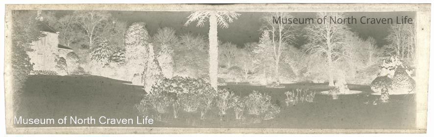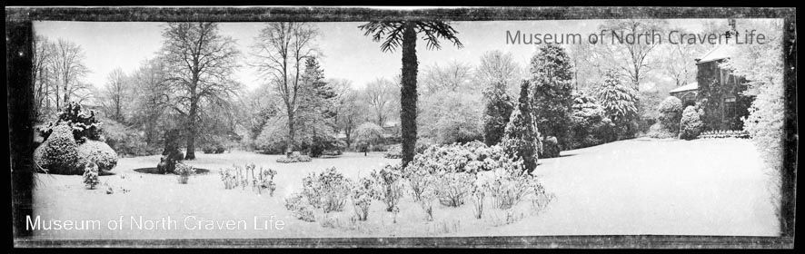 A panaromic silver film negative. A view of Whitefriars in Settle in the snow when it was still a garden (before the construction of the car park)Collection