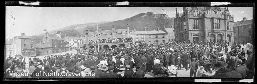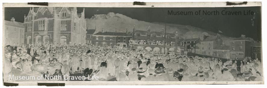 A panaromic silver film negative. A view of the Market Square in Settle and the Shambles (two stories). A large crowd is assembled with a flagpole in the centreCollection