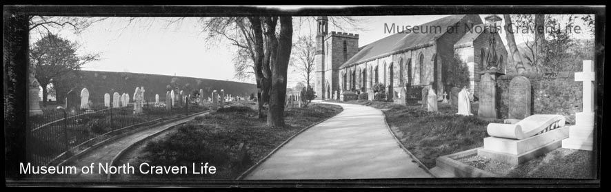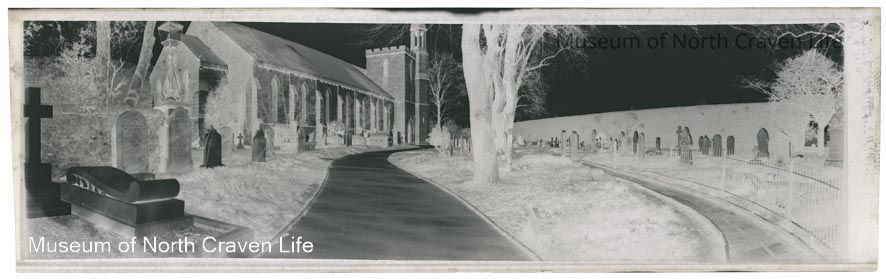 A panaromic silver film negative. A view of the Church of Holy Ascension in Settle looking up through the graveyard to the porch and towerCollection