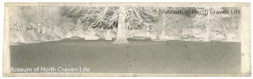 A panaromic silver film negative. A view of Whitefriars in Settle in the snow when it was still a garden (before the construction of the car park)Collection