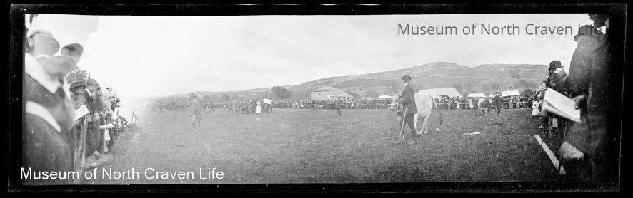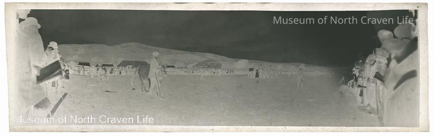 A panaromic silver film negative. A view of Settle show ground with cattle being judged. A large crowd observesCollection