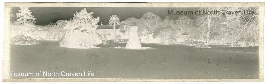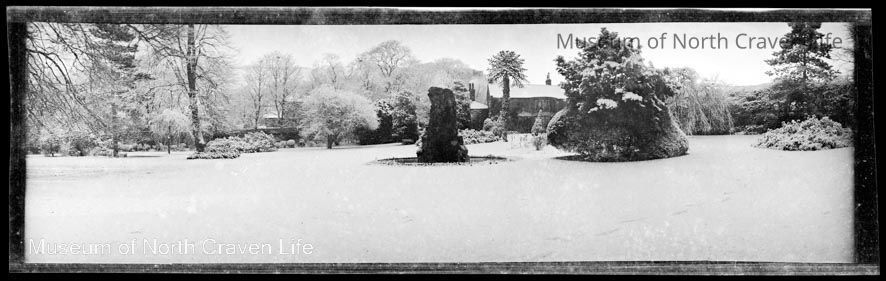 A panaromic silver film negative. A view of Whitefriars in Settle in the snow when it was still a garden (before the construction of the car park)Collection