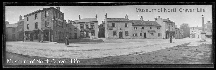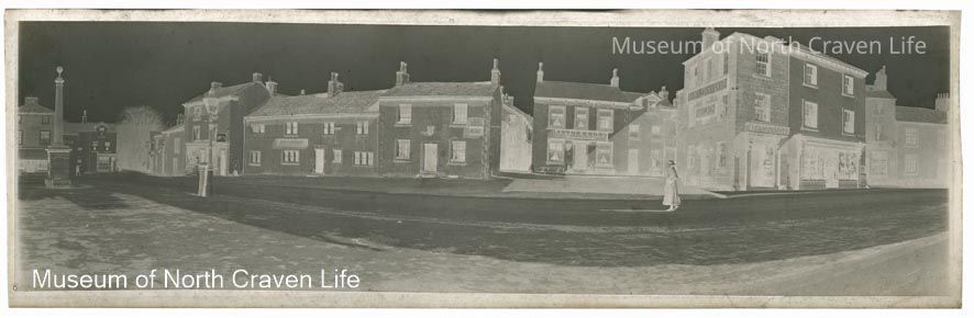 A panaromic silver film negative. A view of the Market Square in Settle with the following premises visible : Shepherd & Walker, Crown Hotel, Naked Man Hotel, Royal Oak HotelCollection