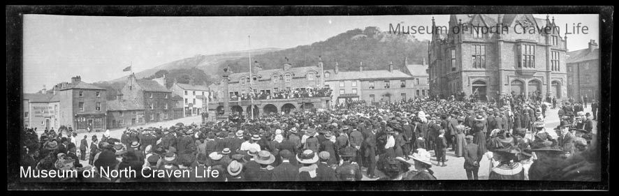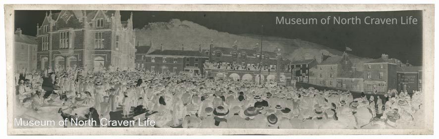 A panaromic silver film negative. A view of the Market Square in Settle and the Shambles (two stories). A large crowd is assembled with a flagpole in the centreCollection